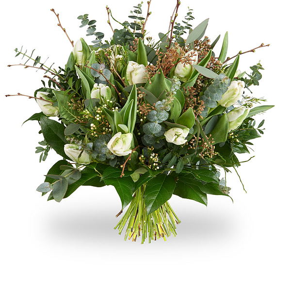 Witte tulpen met prachtig bijmateriaal zoals eucalyptus en bloesemtakken. Een fris boeket voor elk huis!