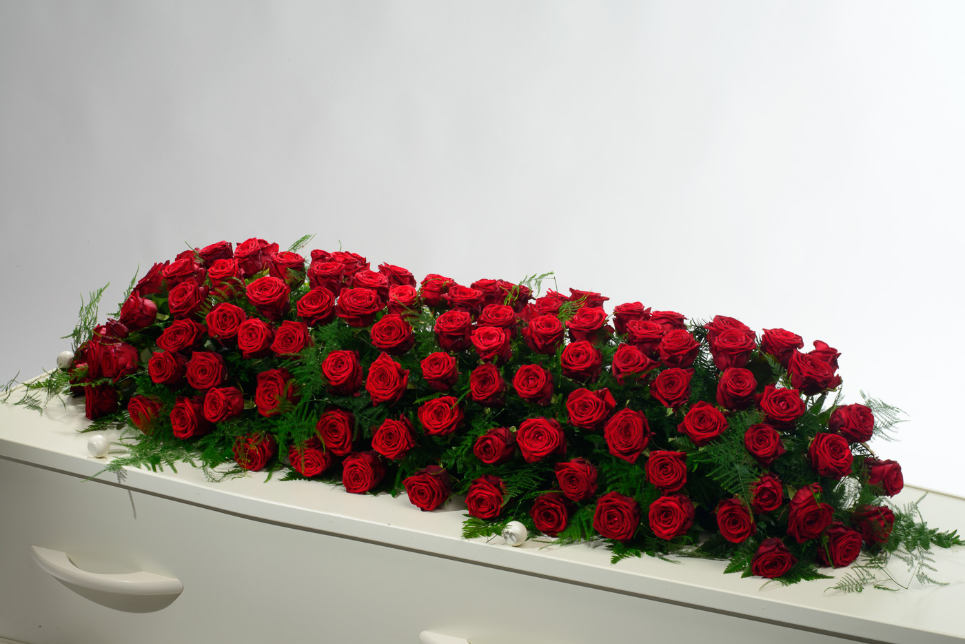 Rouwstuk speciaal voor de kist. Met onder andere prachtige rode rozenmet decoratief siergroen zoals asparagus en eucalyptus.